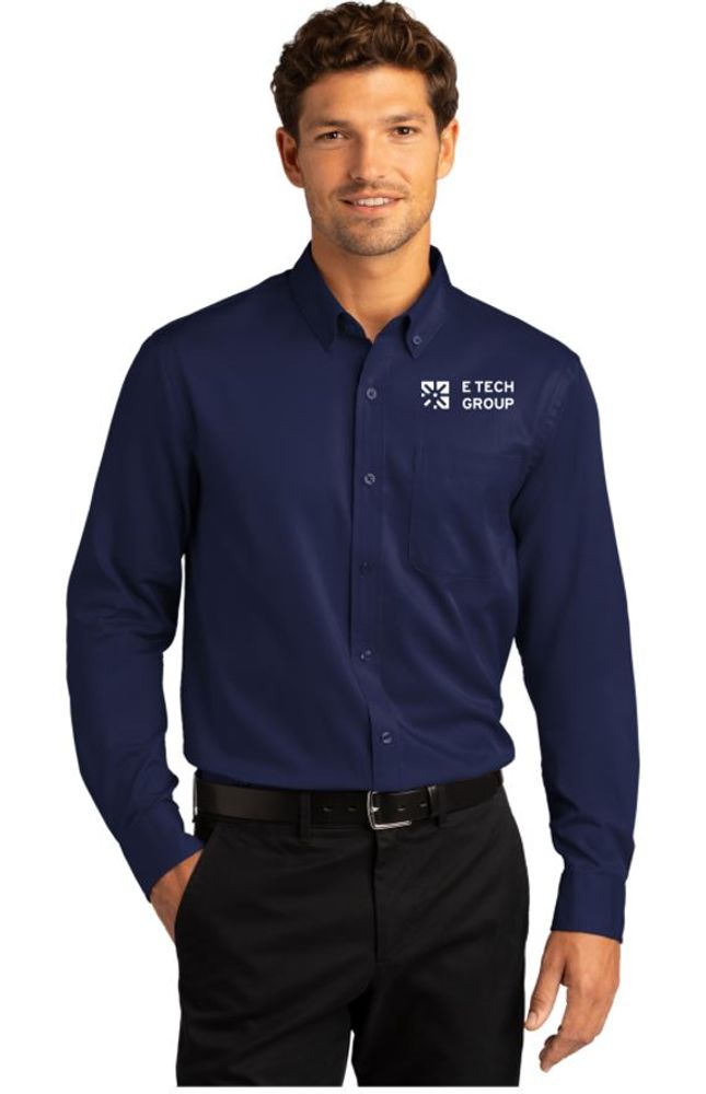 • The ultimate in professional performance, this wrinkle-resistant shirt also releases stains. The soft, smooth fabric gives you a polished look that's comfortable enough for year-round wear. • 4.3-ounce, 55/45 cotton/poly twill • Stain release • Wrinkle-resistant • Button-down collar • Dyed-to-match buttons • Left chest pocket • Rounded adjustable cuffs • Back yoke with box pleat