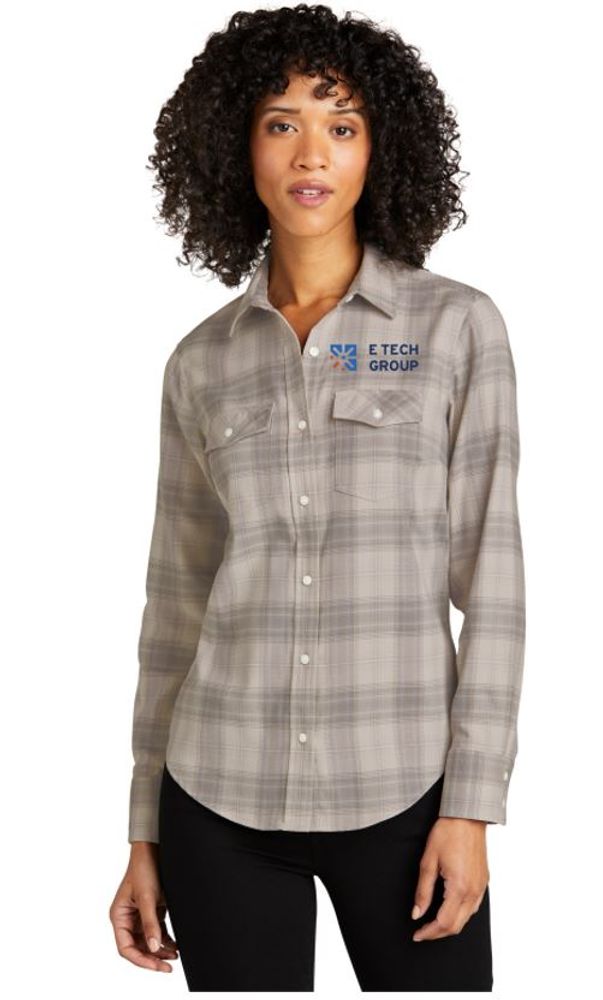 • Casual and cool, this unique ombre plaid shirt is perfect for a uniform look that is laid back, yet polished. • 4.6-ounce, 59/39/2 cotton/polyester/spandex • Lightly brushed twill plaid • Easy Care • Open collar • Bias-cut back yoke • Bust darts • Double-chest pockets with bias-cut button flaps • Pearlized buttons • Double-button cuffs